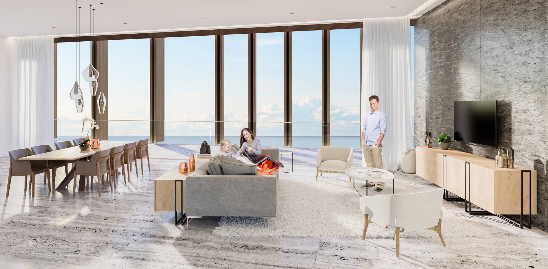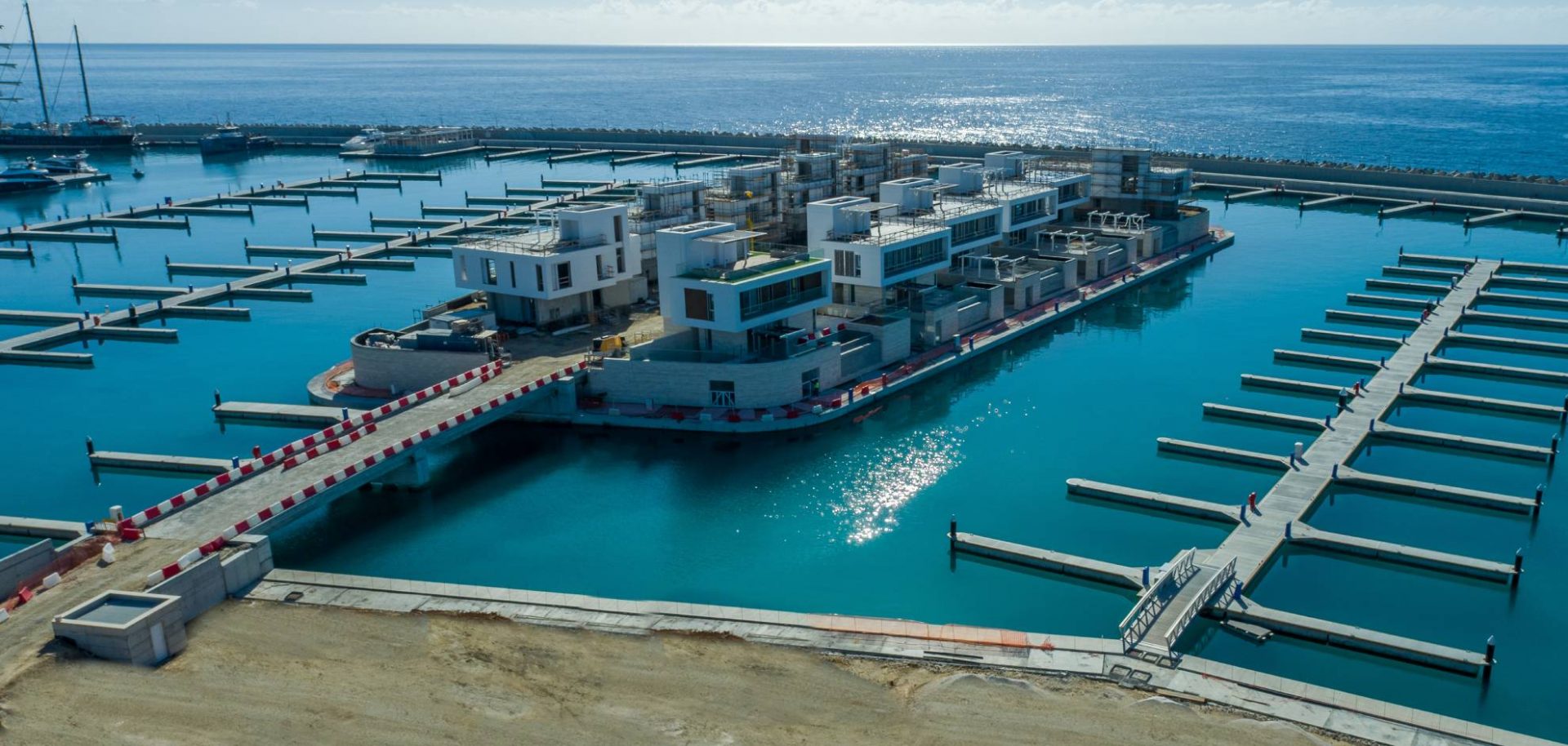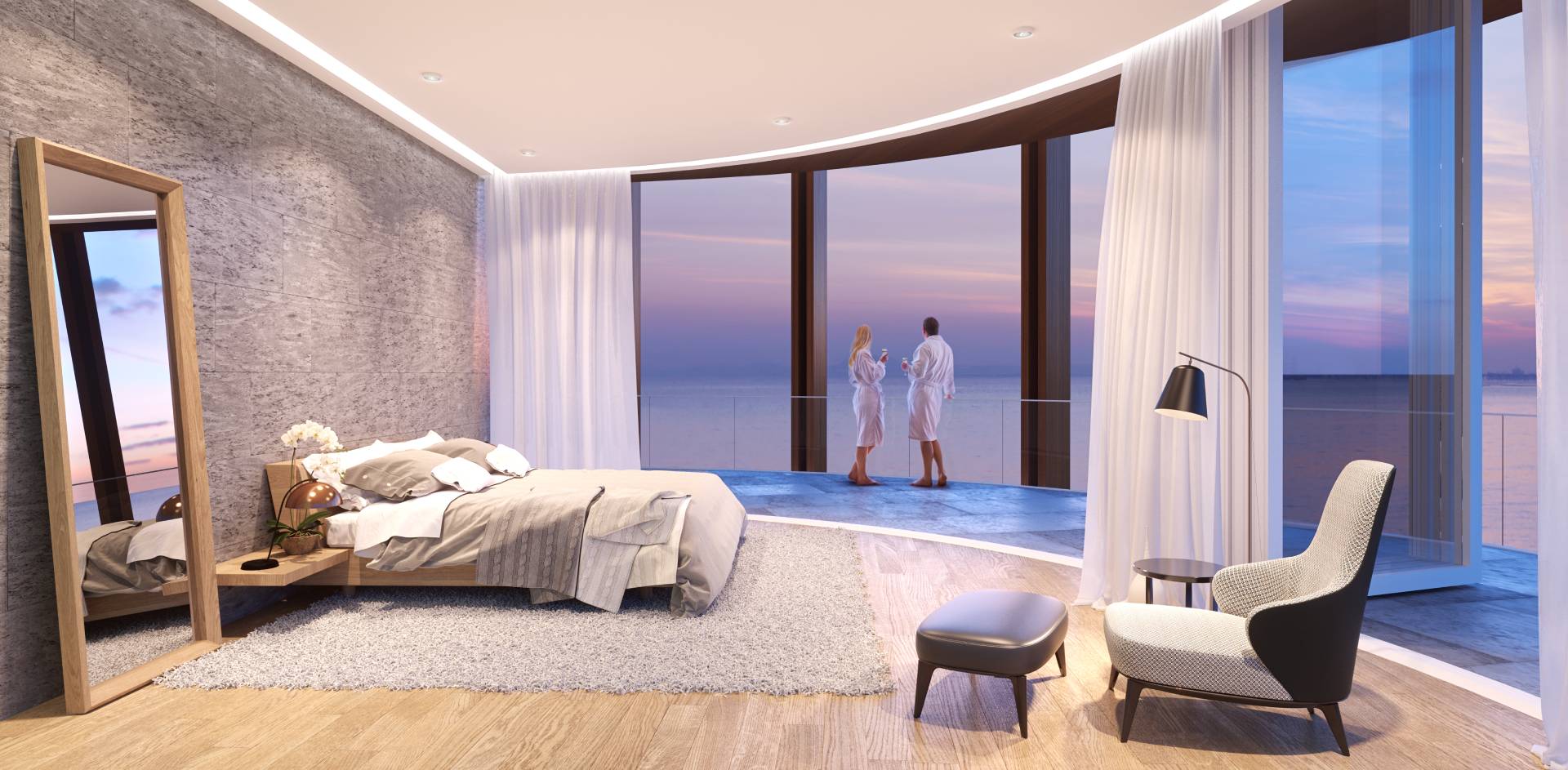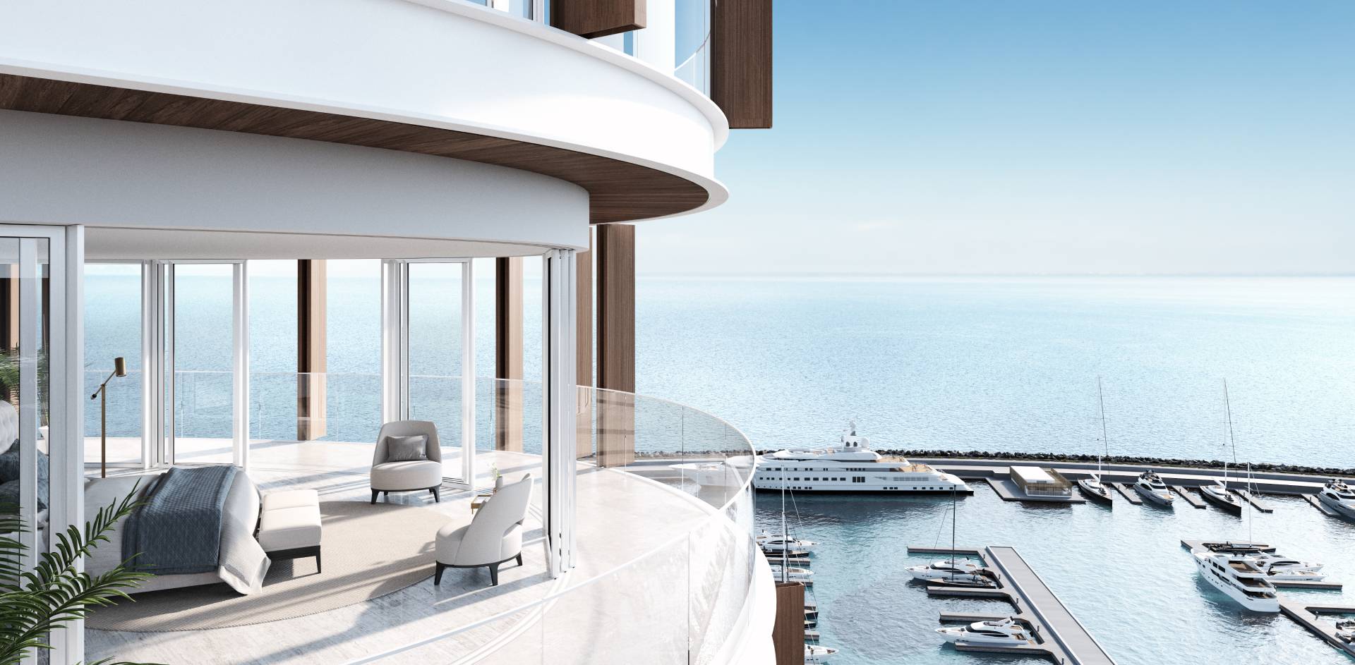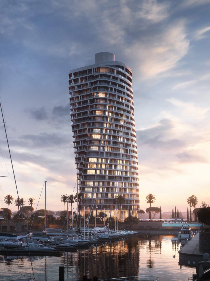 The lobby has an all-glass façade and sculptural ceiling, in a dramatic double height space with views out to an expansive amenity deck elevated over the marina. Taking full advantage of one of the most beautiful stretches of coastline in the Mediterranean, the 125 apartments are uniquely shaped to ensure that all living spaces, including bedrooms, are oriented toward the water and beaches; while the concept of modern, open plan designs maximize daylight and views. The apartments range from a mix of 1, 2, 6-bedroom residences to a full-floor 7-bedroom penthouse at the top floor, that features 360-degree panoramic views. Residents of the three radiused-end apartments enjoy 180-degree views. The private amenities deck includes landscaped gardens and lawn, cabanas, a protected child play area and day-care facilities and two separate pools, one of them specifically tailored to families.